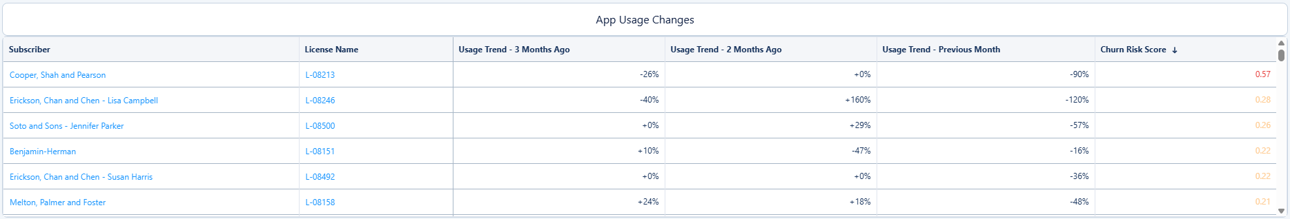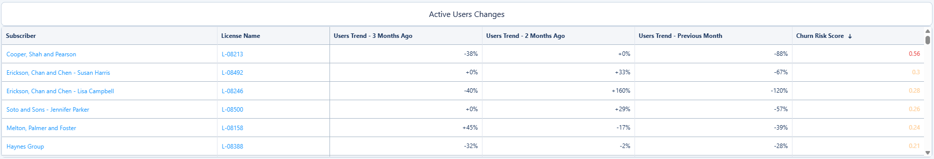 Your customers are sorted by the Churn Risk Score, which is a weighted average of active users number drops in the last three months. This way, the highest risk is associated with the most recent high drops in active users.