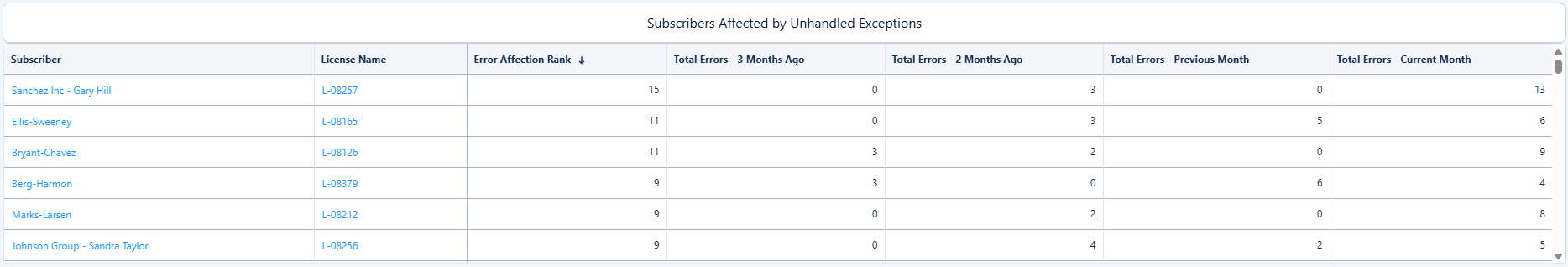 The table below shows how many unhandled exceptions occurred for each customer and calculates the Error Affection Score.