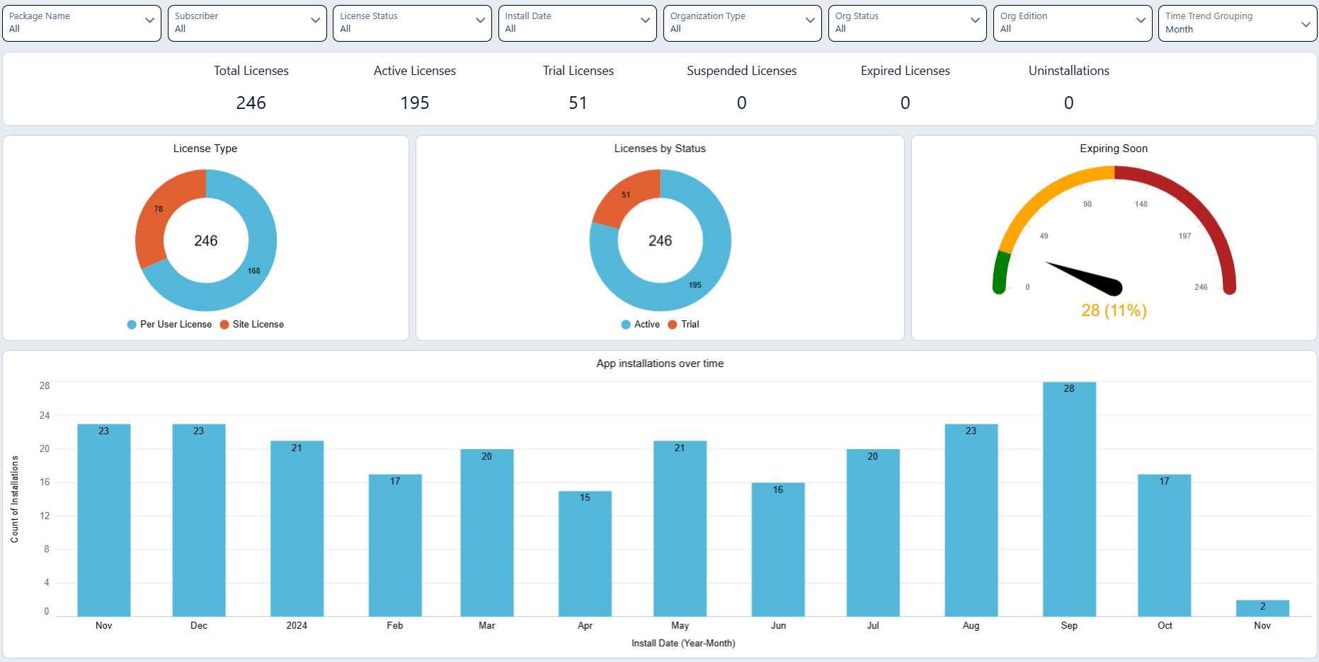 As a Salesforce ISV Partner distributing AppExchange apps, you are provided with two CRM Analytics Growth licenses for free (this matches the number of standard Salesforce licenses provided to Salesforce Partners by default - effectively the default number of Salesforce Users on Partner Business Orgs). They allow you to use our dashboards and also create your own based on the data collected by ISV Analytics.
